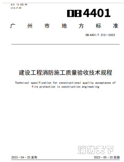 近期,由广州市住房和城乡建设局主编的广州市地方标准《建设工程消防施工质量验收技术规程》(DB 4401/T 212-2023)获批发布,自2023年5月25日起实施。